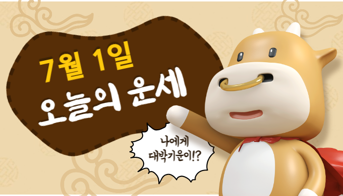 7월 1일 (금) 오늘의 운세 입니다. 금요일인 오늘까지 장맛비가 많이 내리고 내일 토요일부터는 잠시 소강상태에 들어간다 합니다. 국지성으로 폭우가 내리는 지역은 침수피해가 없기를 바라겠습니다. 7월 첫날인 오늘 대박기운이 들어온 띠는 어떤 운세일까요? 아래 해당하는 띠를 누르시면 오늘의 운세를 확인할 수 있습니다.