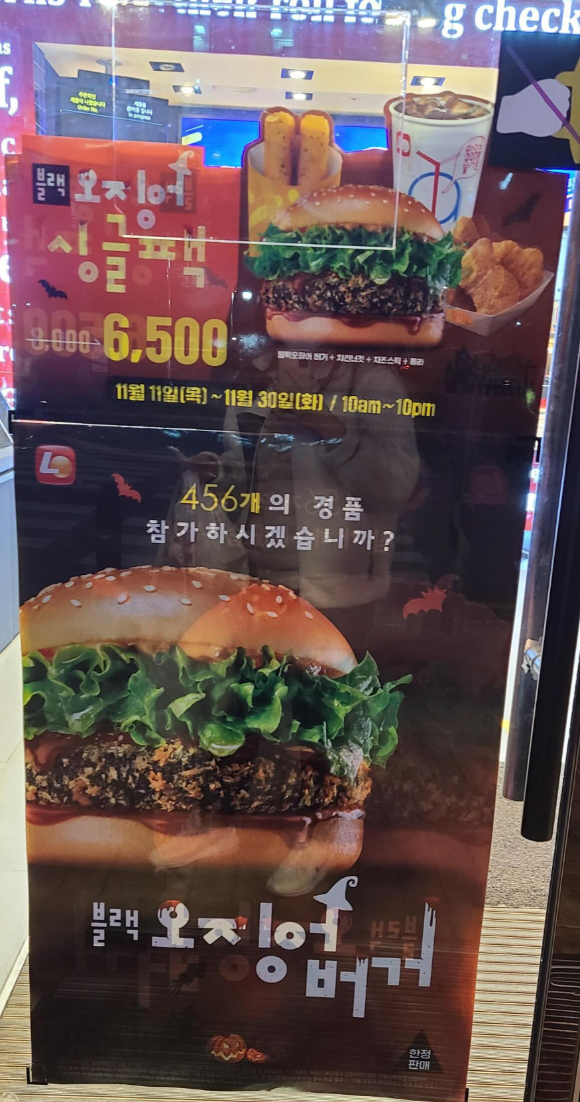 단종되었던 오징어버거가 오징어 게임의 흥행으로 인해 다시 부활하고 여러 가지 행사를 진행하고 있더라고요. 1등 상금이 무려 456만원이라니 인기가 대단합니다. 노트북, 아이폰, 갤럭시 워치 등등 456개의 경품 중 100% 당첨 가능하다 하니 행사 끝나기 전에 한번 드셔 보시기를 추천드립니다. 버거는 생각보다 매콤한 편이라 하니 매운맛을 좋아하시는 분들은 도전 안 해볼 이유가 없을 것 같습니다!