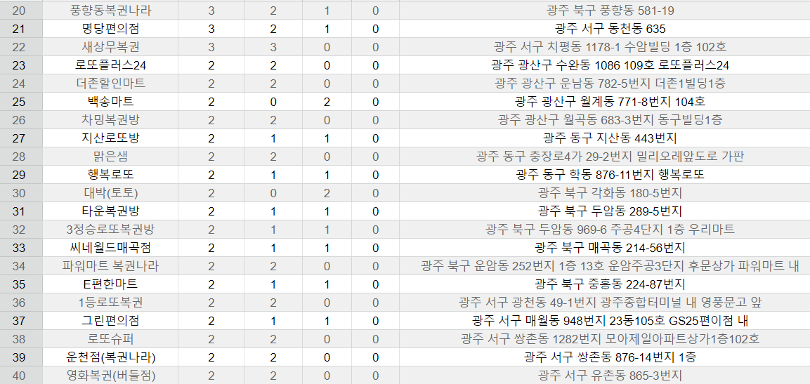 🎁1등을 2회 이상 배출한 광주지역 로또 명당 판매점 순위입니다.