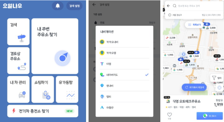 오일 나우 : 지역화폐 사용 가능한 주유소를 검색할 수 있다. 주유소를 선택하면 네비 앱으로 바로 경로 안내를 받을 수 있다.