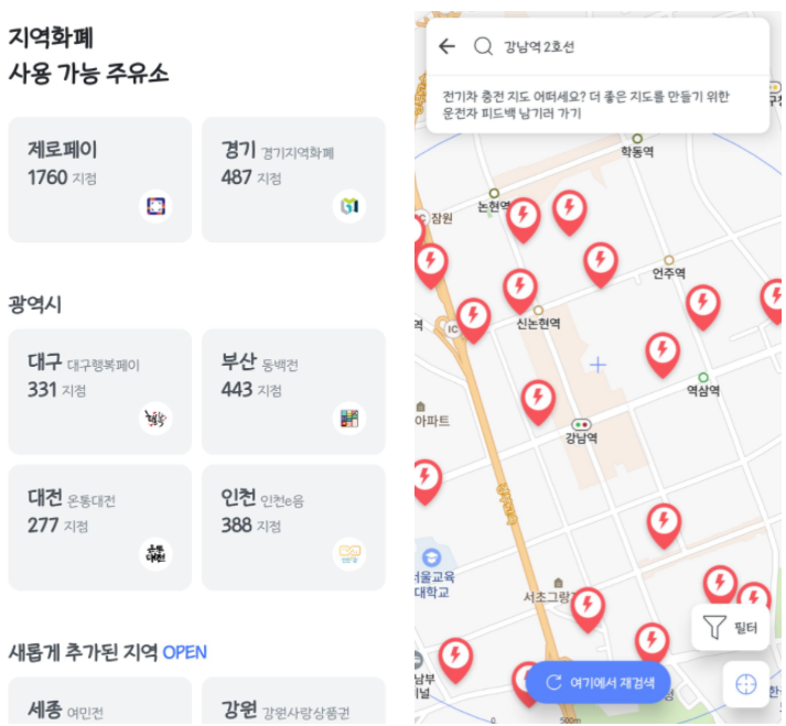 또한, 지역화폐를 사용할 수 있는 주유소도 별도로 확인할 수 있습니다. (별도의 주유할인 카드를 사용하지 않으시는 분들은 지역화폐 혜택을 이용할 수 있다는 장점이 있습니다.) 전기차를 이용 중이신 분들이라면 전기차 충전소도 확인이 가능합니다.