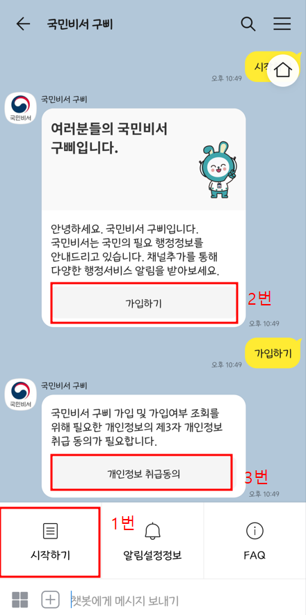 왼쪽 하단의 시작하기 버튼을 누르세요. 가입하기 버튼을 누르면 개인정보 취급 동의 버튼을 확인할 수 있습니다.