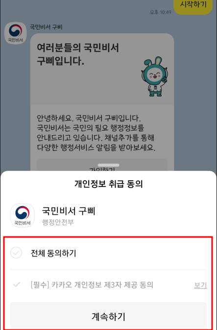 전체 동의하기를 누르고 계속하기를 눌러 다음 단계로 넘어갑니다.