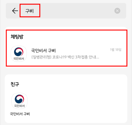 카카오톡 채팅방 오른쪽 상단의 돋보기 모양을 누른 후 구삐를 검색해 주세요. 국민 비서 구삐와 채팅으로 신청을 진행합니다.