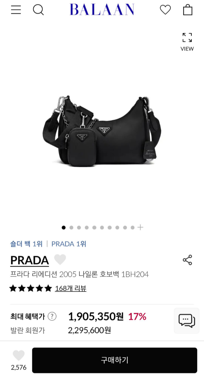 그럼 얼마나 할인이 되는지 한번 알아볼까요~? 평소에 관심 있었던 프라다 제품을 둘러봤습니다. 가격이 1주일마다 오르는 느낌의 브랜드 중 하나인데요. 숄더백 부분 1위인 대표상품을 찾아봤습니다.