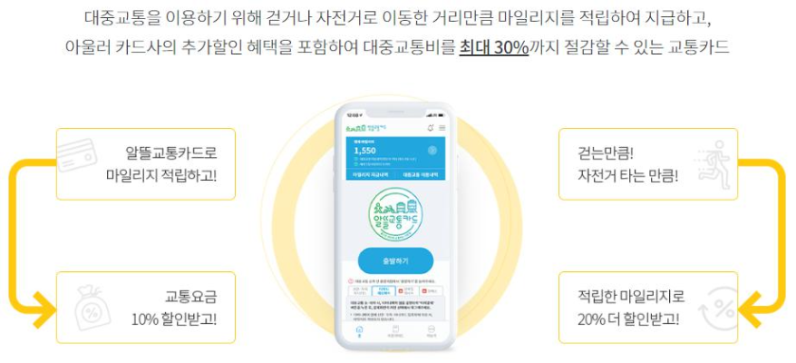 알뜰교통카드는 대중교통 이용금액에서 최대 30%까지 할인된 금액으로 이용할 수 있는 제도입니다. 마일리지가 적립되며 교통요금이 할인되는 서비스로 대중교통 이용을 위해 걷기, 자전거로 이동한 거리만큼 마일리지를 계산하여 지급해줍니다.