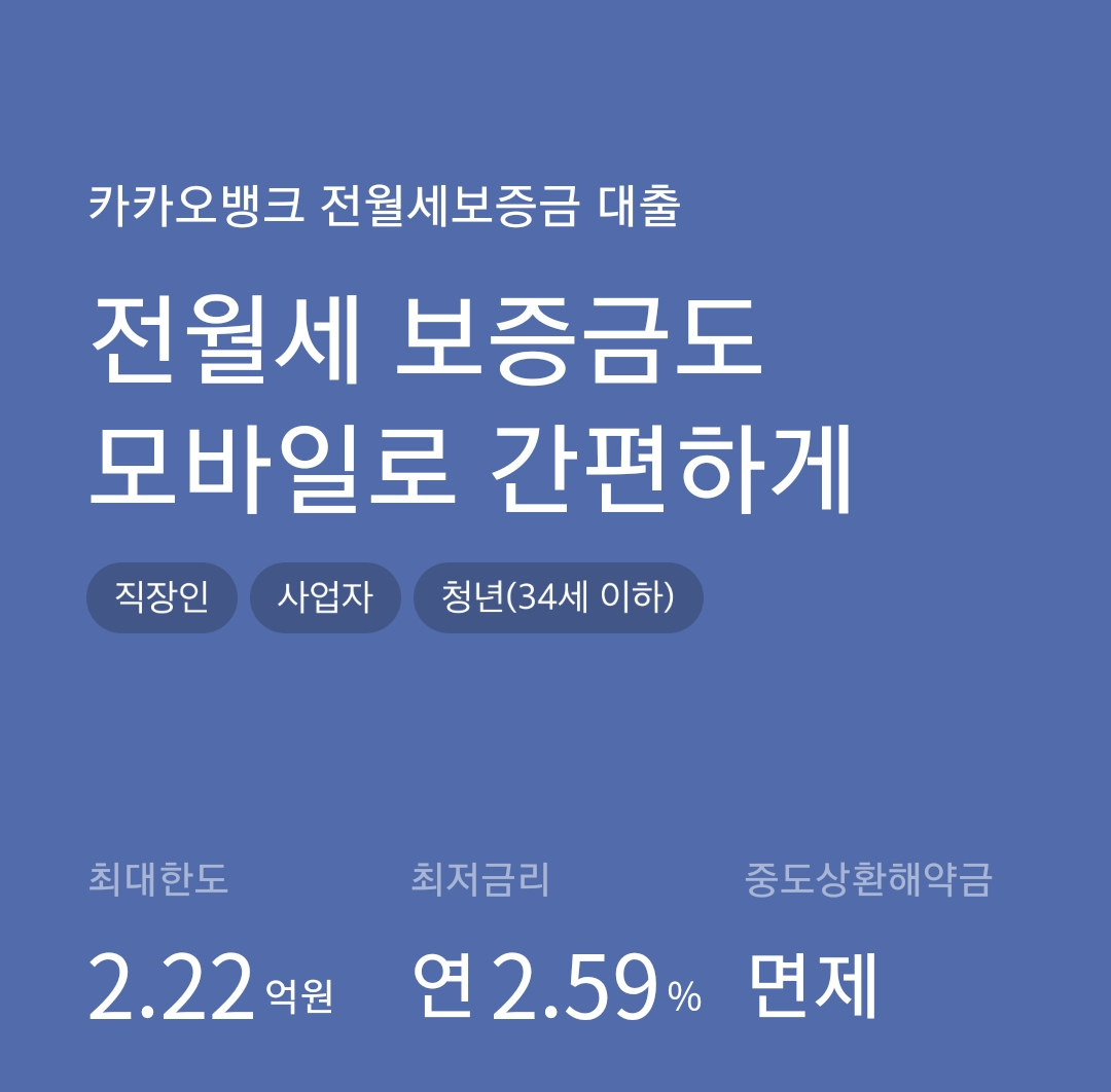 카카오 뱅크 전월세 보증금 대출은 최대한도 2.22억 원 , 최저금리 연 2.59%이며 중도상환 해약금 면제인 상품입니다.